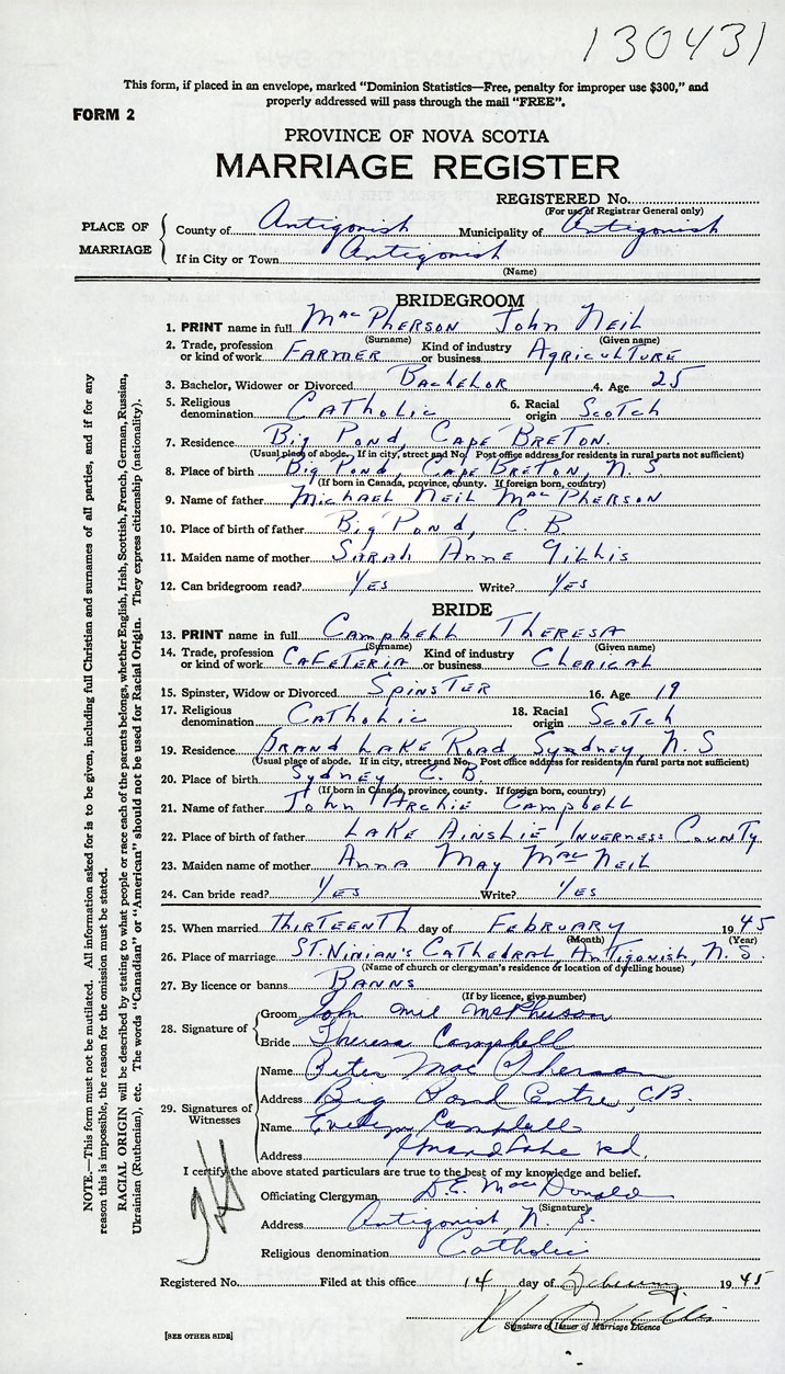 26. Place of marriage St Ninian’s Cathedral Antigonish, Antigonish County