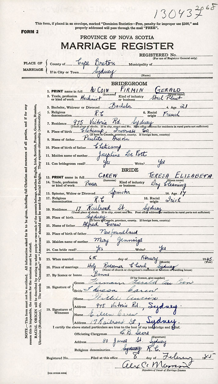26. Place of marriage Holy Redeemer Church Sydney, Cape Breton County