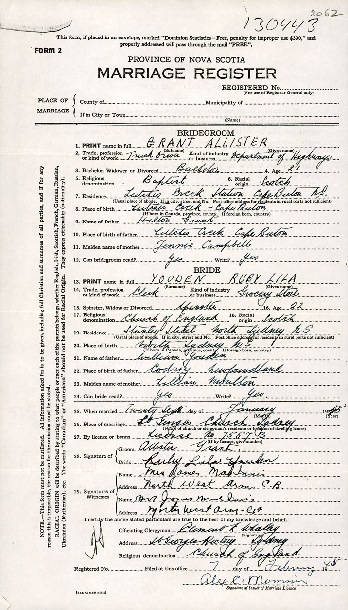 26. Place of marriage St George's Church Sydney, Cape Breton County