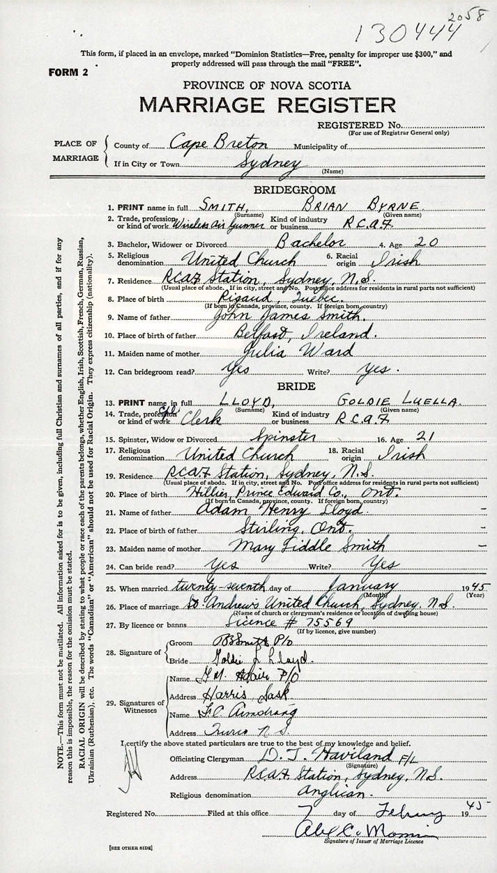 26. Place of marriage St Andrew's United Church Sydney, Cape Breton County
