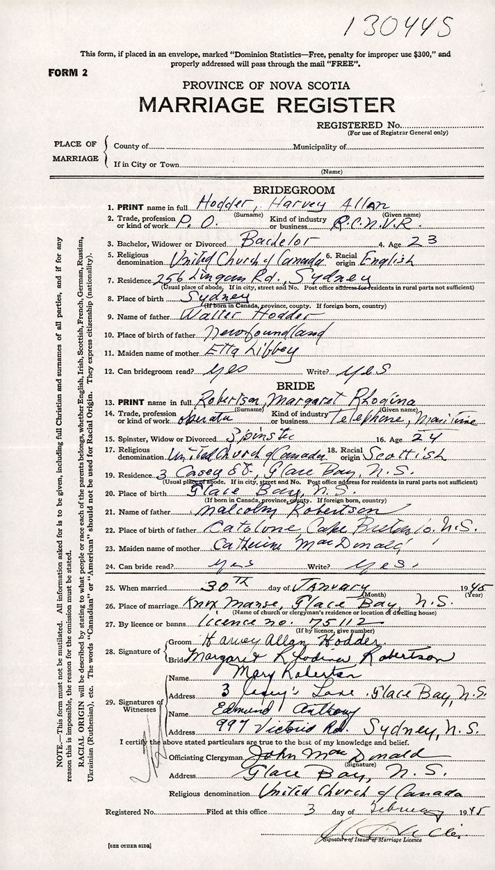 PLACE OF MARRIAGE County of Cape Breton in City or Town Glace Bay