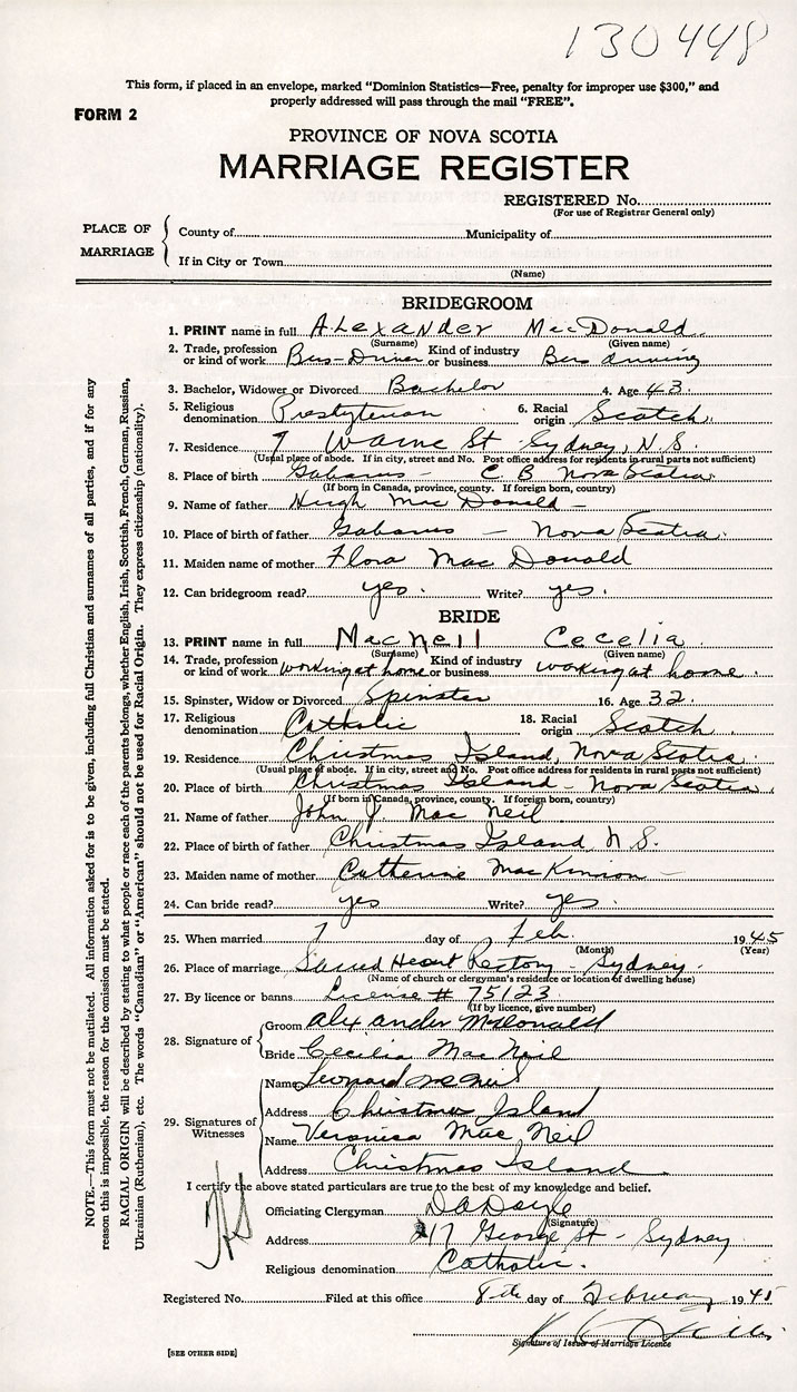 PLACE OF MARRIAGE County of Cape Breton in City or Town Sydney