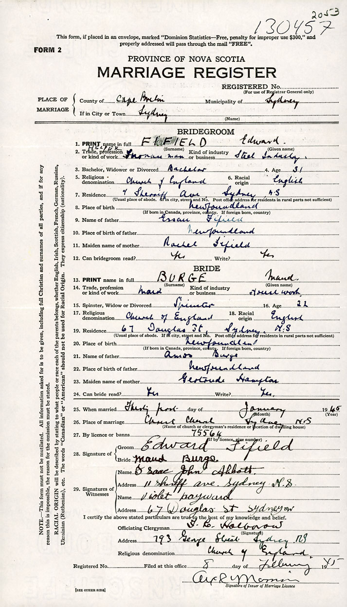 26. Place of marriage Christ Church Sydney, Cape Breton County