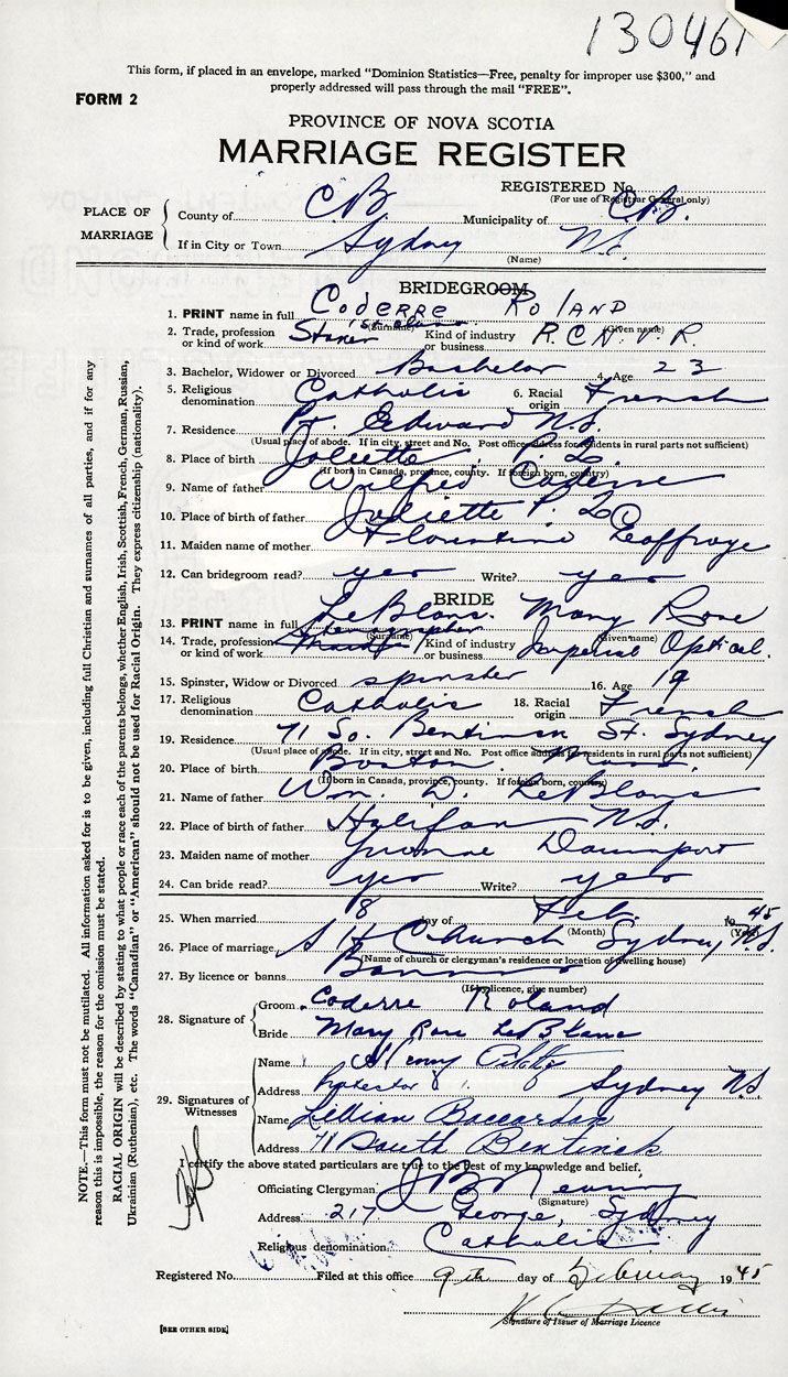 26. Place of marriage Sacred Heart Church Sydney, Cape Breton County