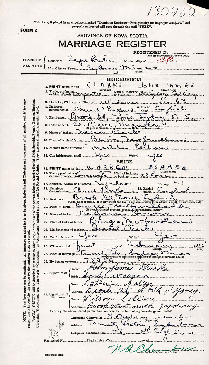 26. Place of marriage Trinity Ch. Sydney Mines, Cape Breton County