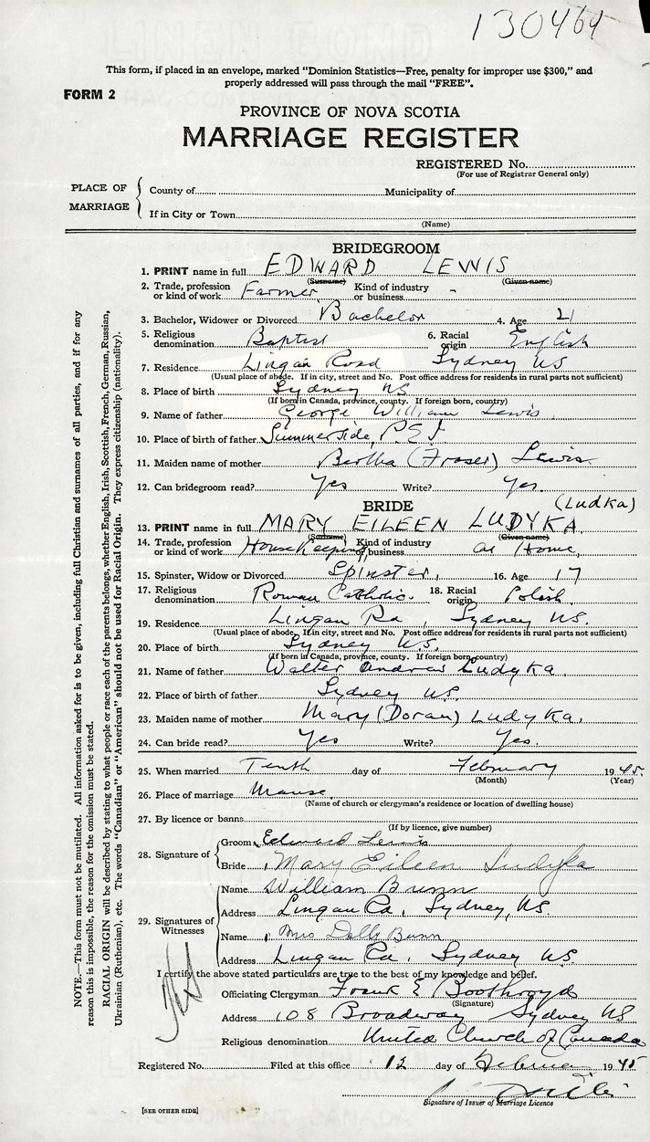 PLACE OF MARRIAGE County of Cape Breton in City or Town Sydney