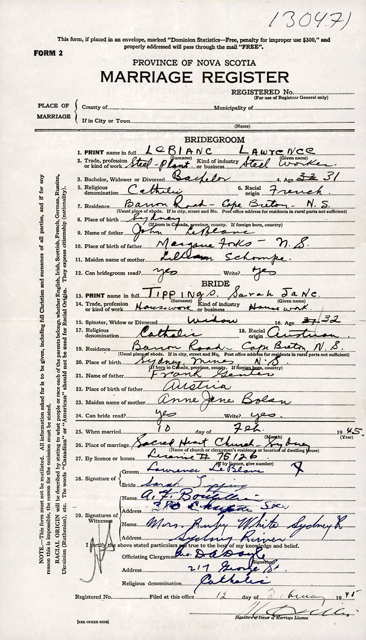 26. Place of marriage Sacred Heart Church Sydney, Cape Breton County