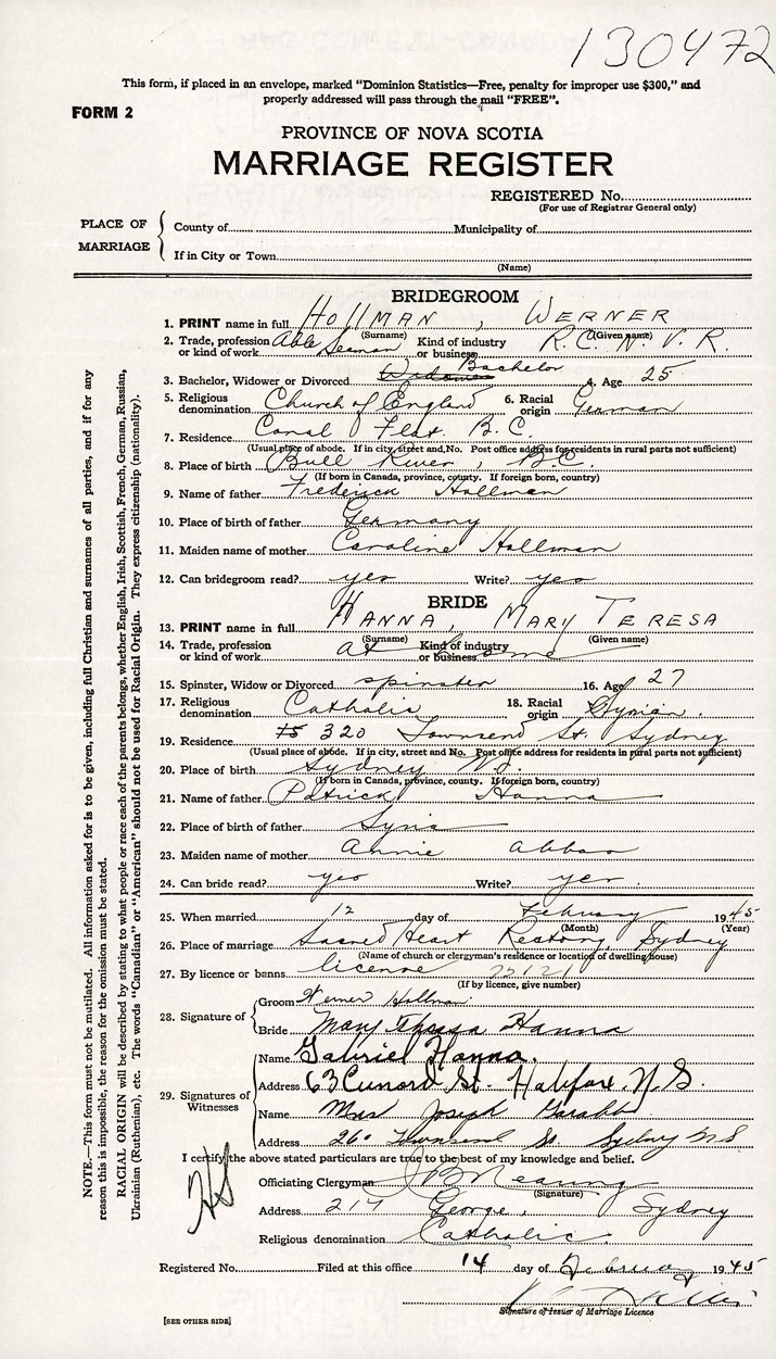 26. Place of marriage Sacred Heart Rectory Sydney, Cape Breton County