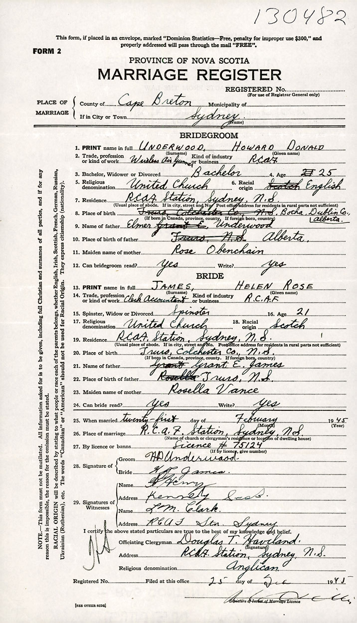26. Place of marriage RCAF Station Sydney, Cape Breton County