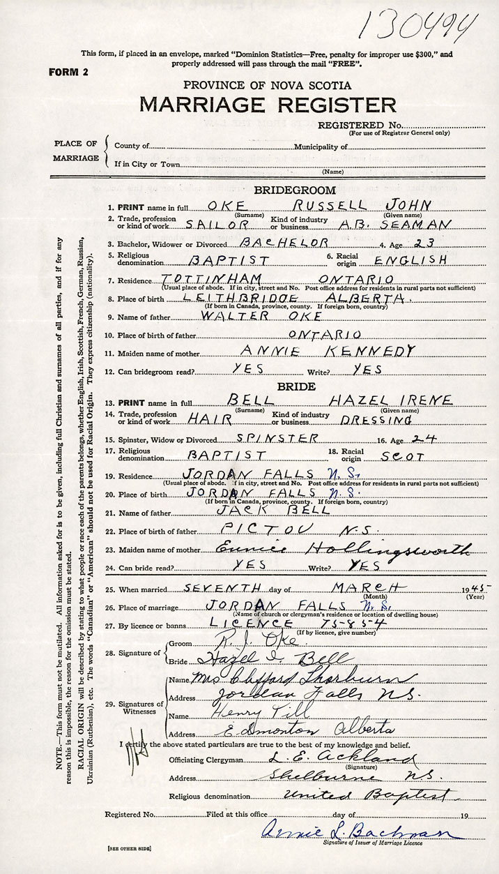 26. Place of marriage Jordan Falls, Shelburne County