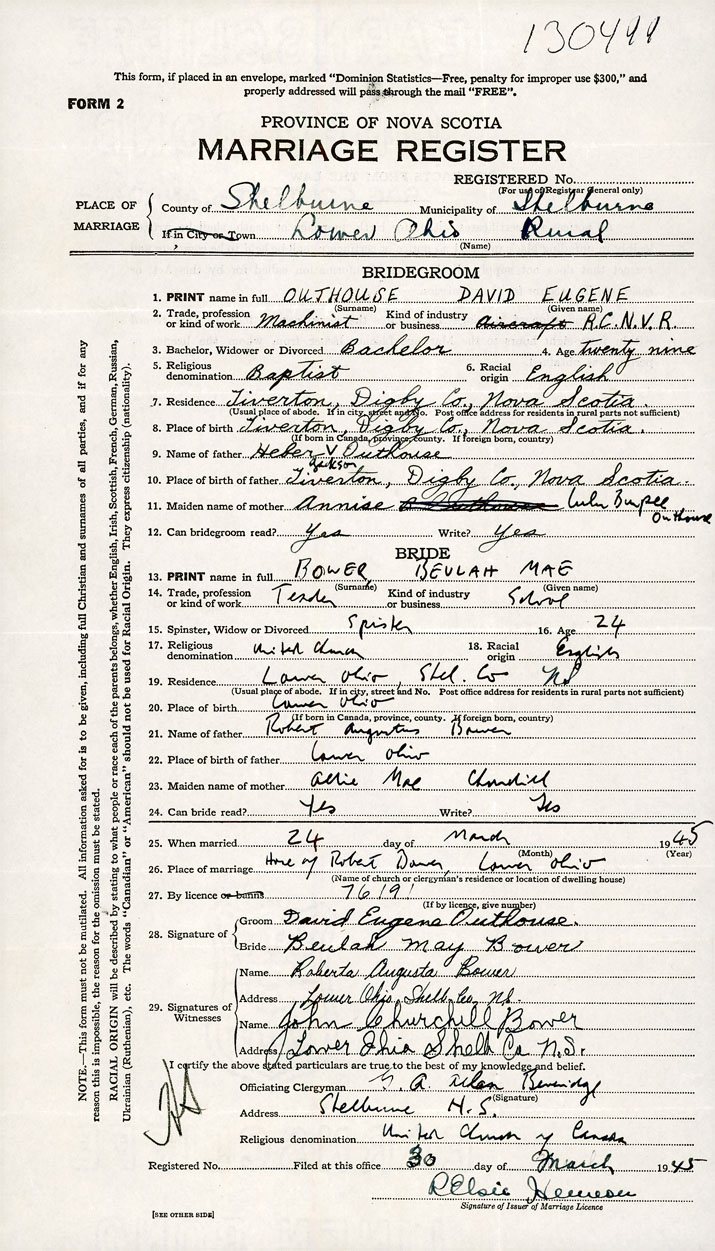 26. Place of marriage Home of Robert Bower Lower Ohio, Shelburne County