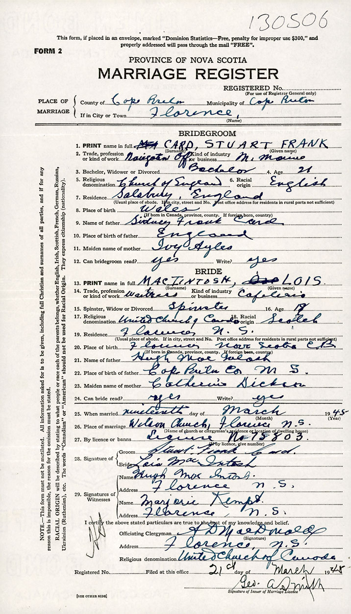 26. Place of marriage Watson Church Florence, Cape Breton County