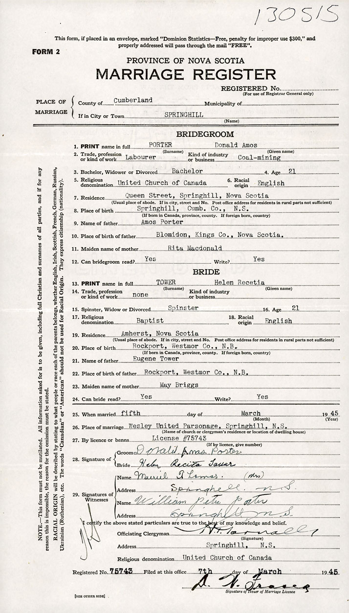 PLACE OF MARRIAGE County of Cumberland in City or Town Springhill