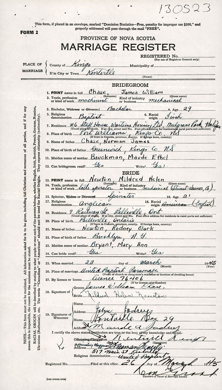 According to a certified copy of the Decree Absolute for Divorce dated 1956-2-7 and filed in the Office of the Registrar General under Divorce number 10-35, it is ordered that the marriage of James William Chase and Mildred Helen Newton (Registered under marriage number 1945-130523) be null and void.
