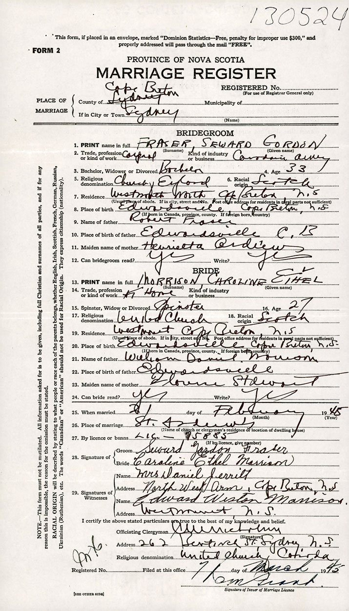 PLACE OF MARRIAGE County of Cape Breton in City or Town Sydney