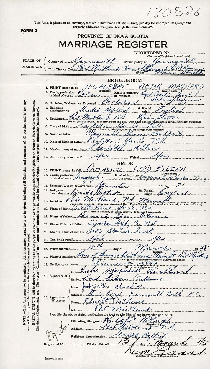 26. Place of marriage Home of Bernard Outhouse Port Maitland, Yarmouth County