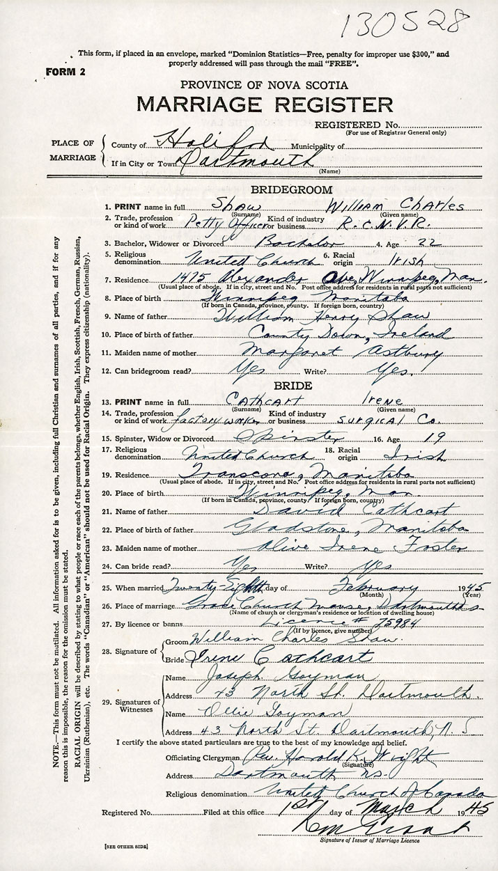 PLACE OF MARRIAGE County of Halifax in City or Town Dartmouth