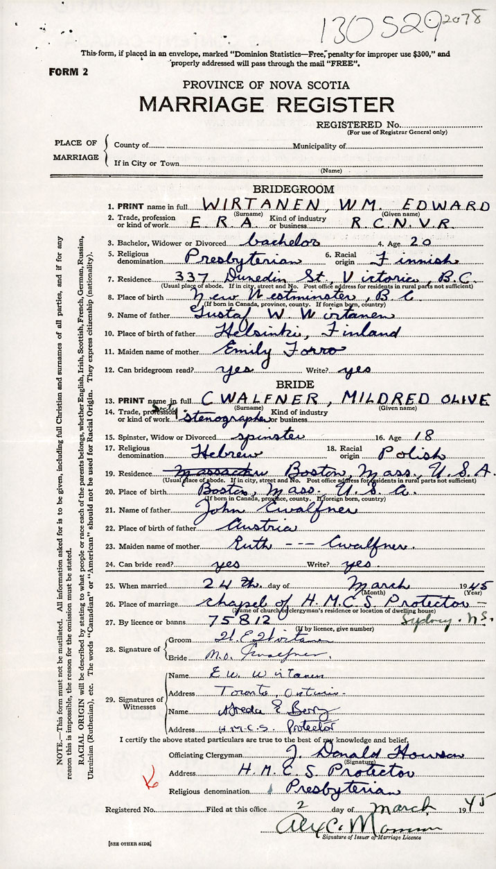 26. Place of marriage Chapel HMCS Protector Sydney, Cape Breton County