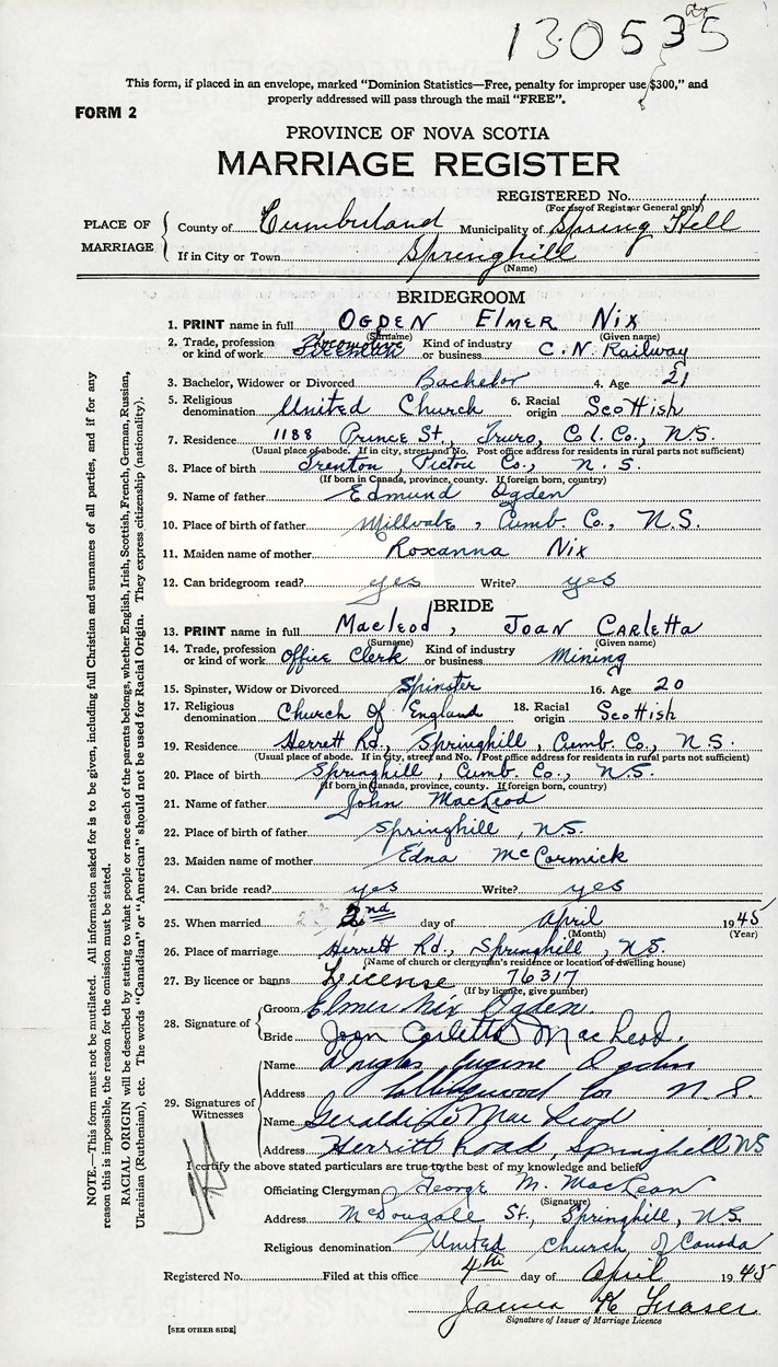 PLACE OF MARRIAGE County of Cumberland in City or Town Springhill