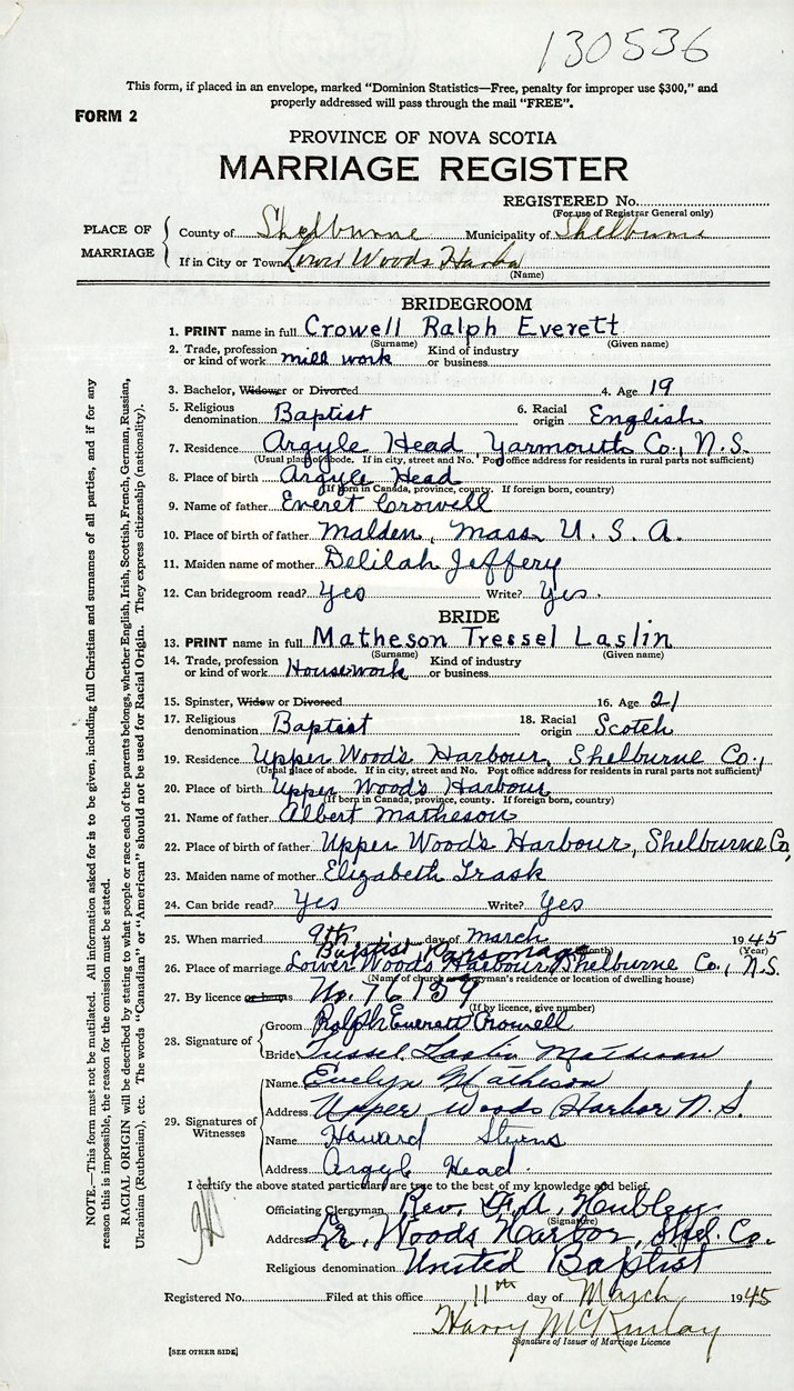 PLACE OF MARRIAGE County of Shelburne in City or Town Lower Woods Harbour