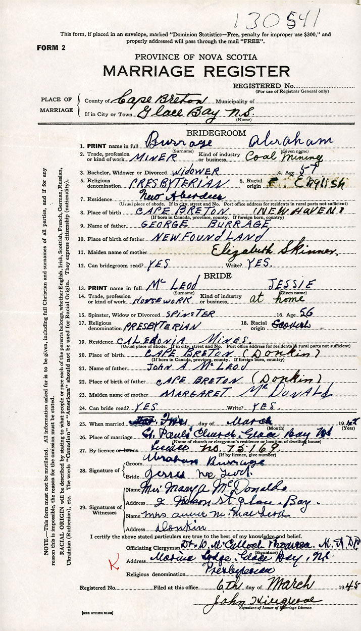 PLACE OF MARRIAGE County of Cape Breton in City or Town Glace Bay