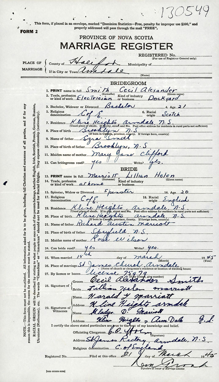 According to a certified copy of the Decree Absolute for Divorce dated 1971-5-4 and filed in the Office of the Registrar General under Divorce number 71001280, it is ordered that the marriage of Cecil Alexander Smith and Lillian Helen Marriott (Registered under marriage number 1945-130549) be null and void.