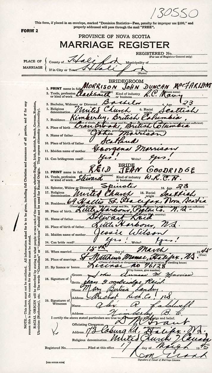 PLACE OF MARRIAGE County of Halifax in City or Town Halifax