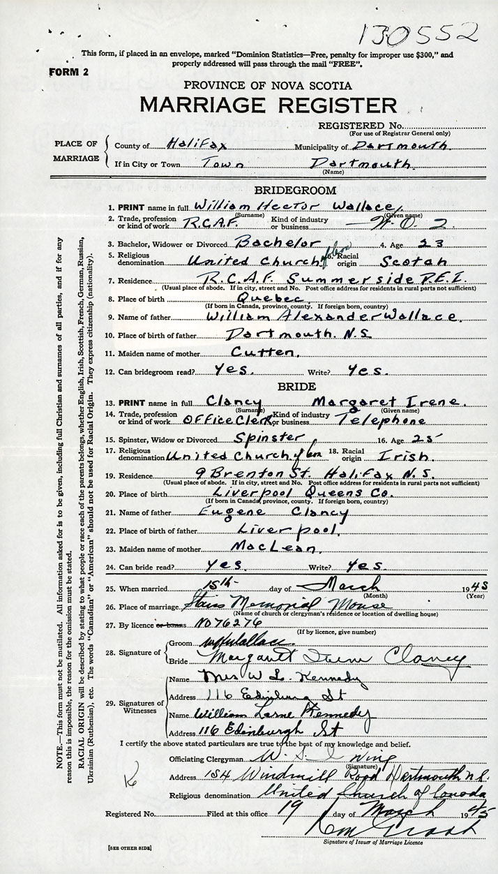 According to a certified copy of the Decree Absolute for Divorce dated 1953-8-18 and filed in the Office of the Registrar General under Divorce number 294, it is ordered that the marriage of William Hector Wallace and Margaret Irene Clancy (Registered under marriage number 1945-130552) be null and void.