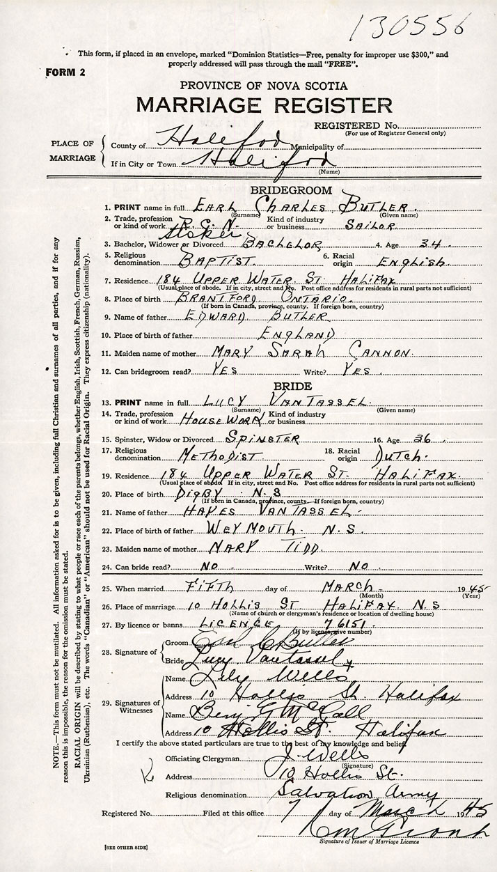 26. Place of marriage 10 Hollis St. Halifax, N.S. Halifax, Halifax County