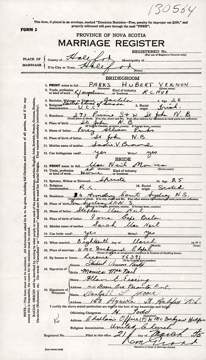 26. Place of marriage HMC Dockyard Halifax, Halifax County