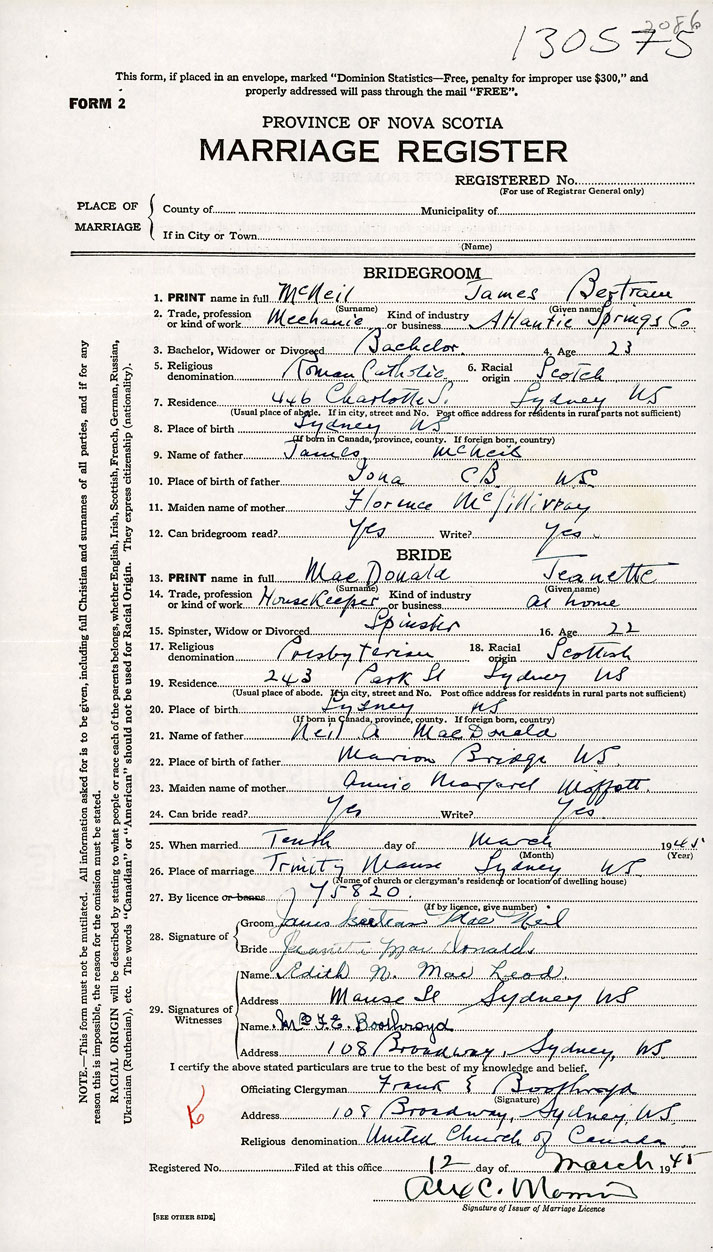 PLACE OF MARRIAGE County of Cape Breton in City or Town Sydney