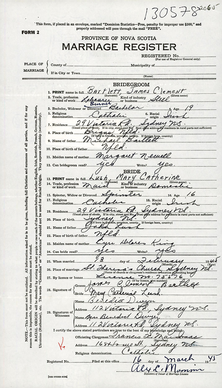 26. Place of marriage St. Theresa's Church Sydney , Cape Breton County