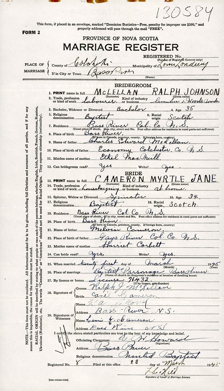 26. Place of marriage Baptist Parsonage Bass River, Colchester County