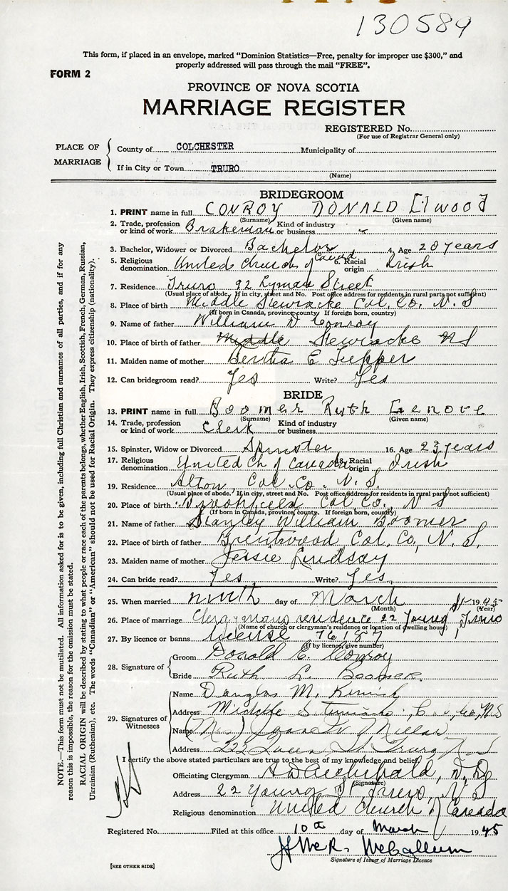 26. Place of marriage Clergy's residence Truro, Colchester County