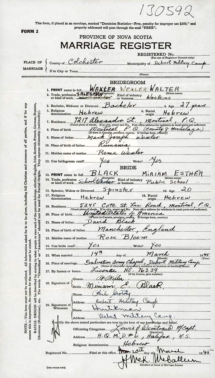 26. Place of marriage Salvation Army Chapel Debert, Colchester County