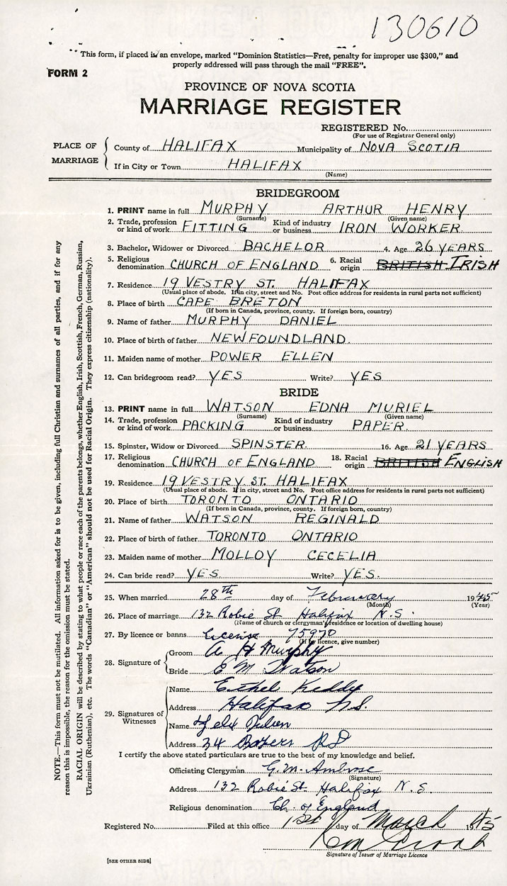 26. Place of marriage 132 Robie St. Halifax Nova Scotia Halifax, Halifax County