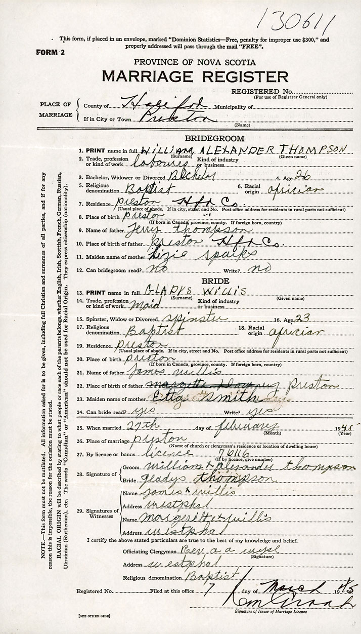 26. Place of marriage Preston, Halifax County