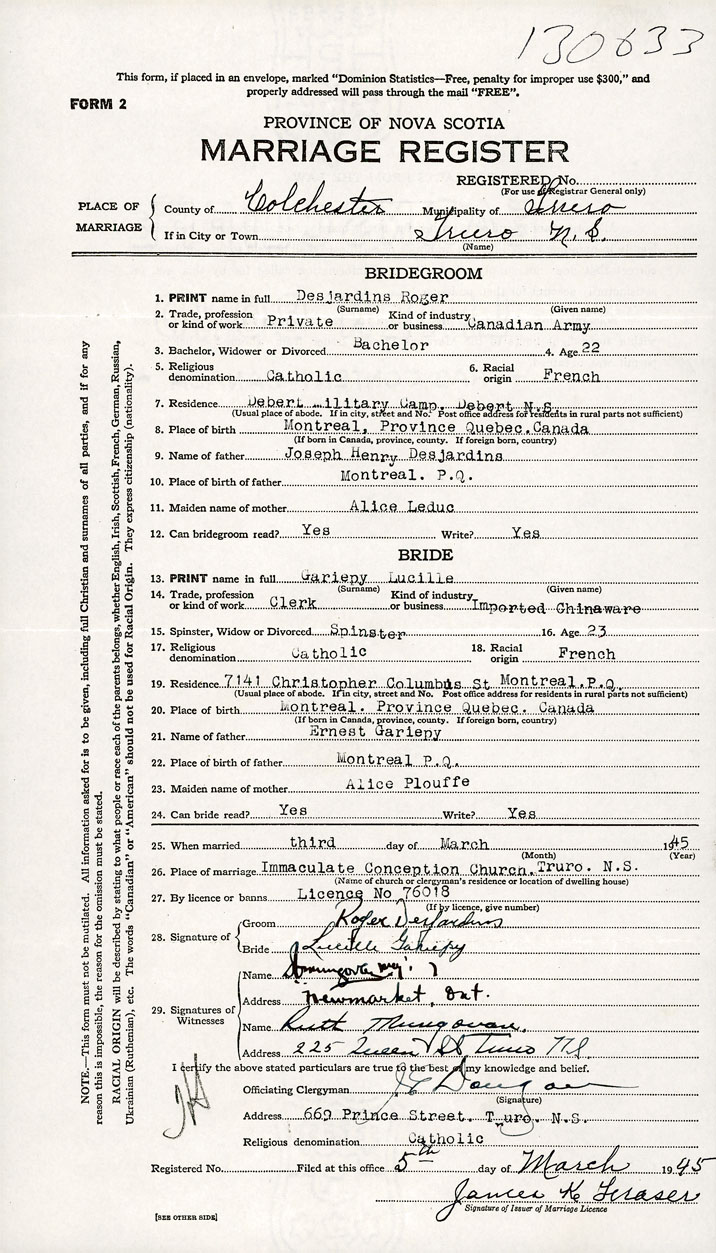 26. Place of marriage Immaculate Conception Church Truro, Colchester County
