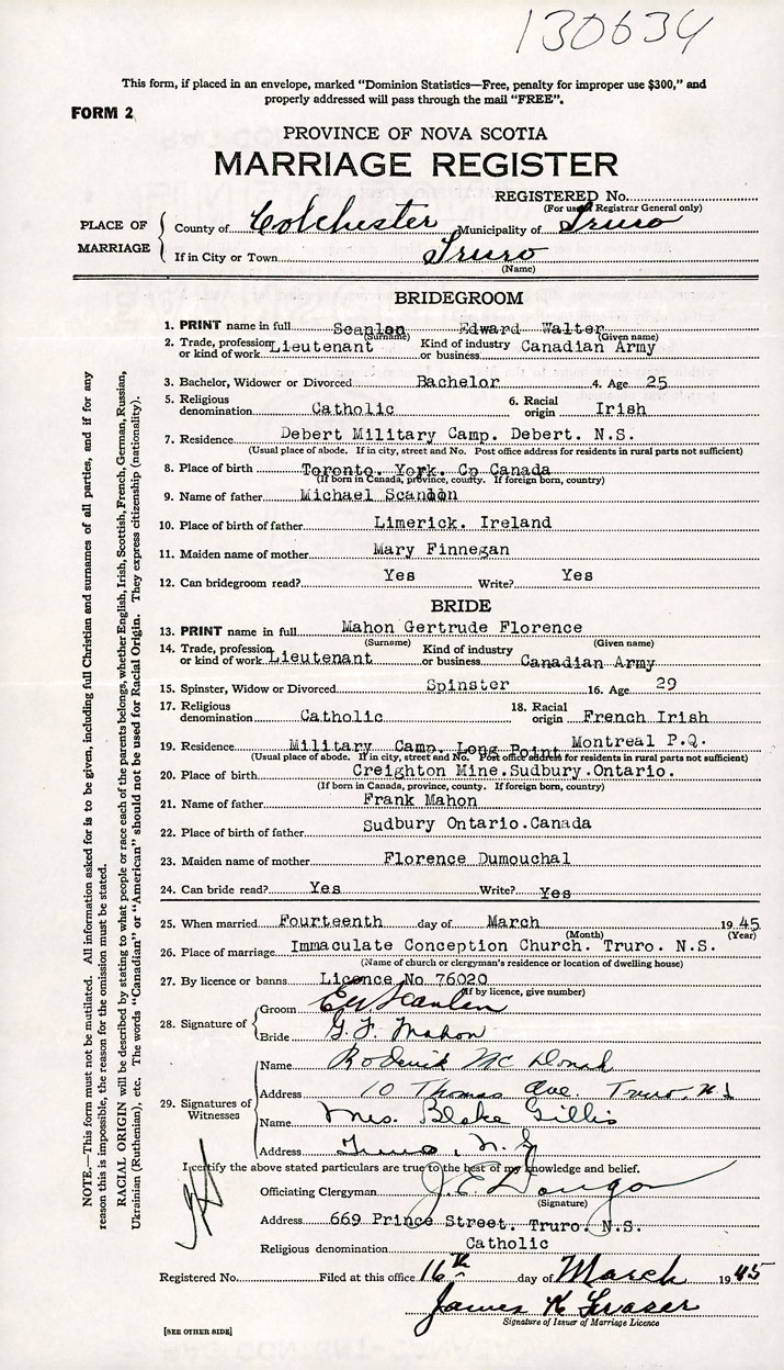 26. Place of marriage Immaculate Conception Church Truro, Colchester County
