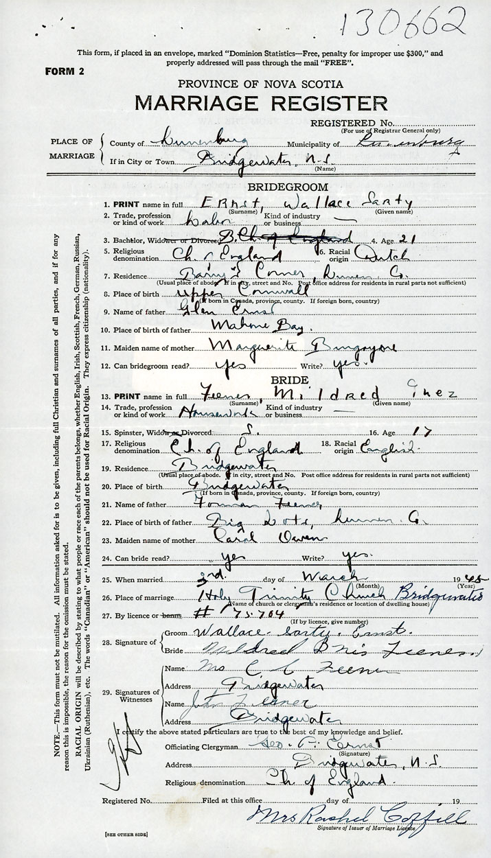 PLACE OF MARRIAGE County of Lunenburg in City or Town Bridgewater