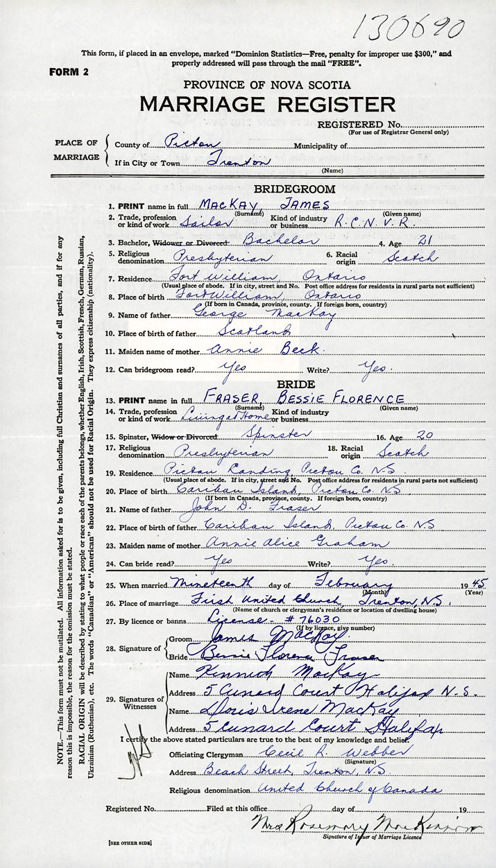 26. Place of marriage Trenton, Pictou County