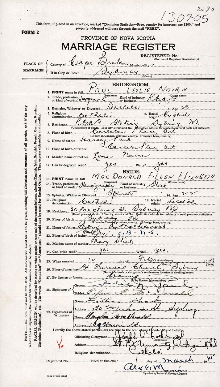 26. Place of marriage St. Theresa's Church Sydney, Cape Breton County