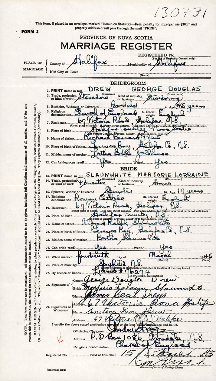 PLACE OF MARRIAGE County of Halifax in City or Town Spryfield