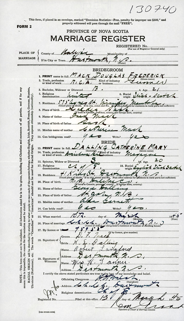 PLACE OF MARRIAGE County of Halifax in City or Town Dartmouth