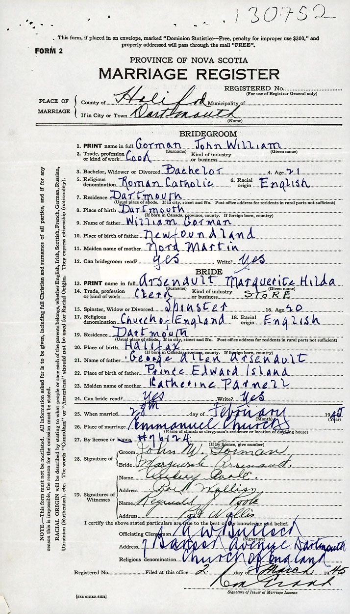According to a certified copy of the Decree Absolute for Divorce dated 1964-4-6 and filed in the Office of the Registrar General under Divorce number 64-001144, it is ordered that the marriage of John William Gorman and Marguerite Arsenault (Registered under marriage number 1945-130752) be null and void.