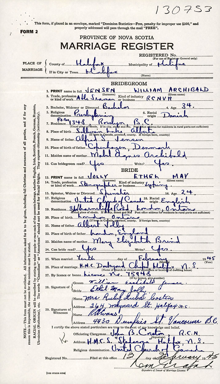 26. Place of marriage H.M.C. Dockyard Chapel Halifax, Halifax County