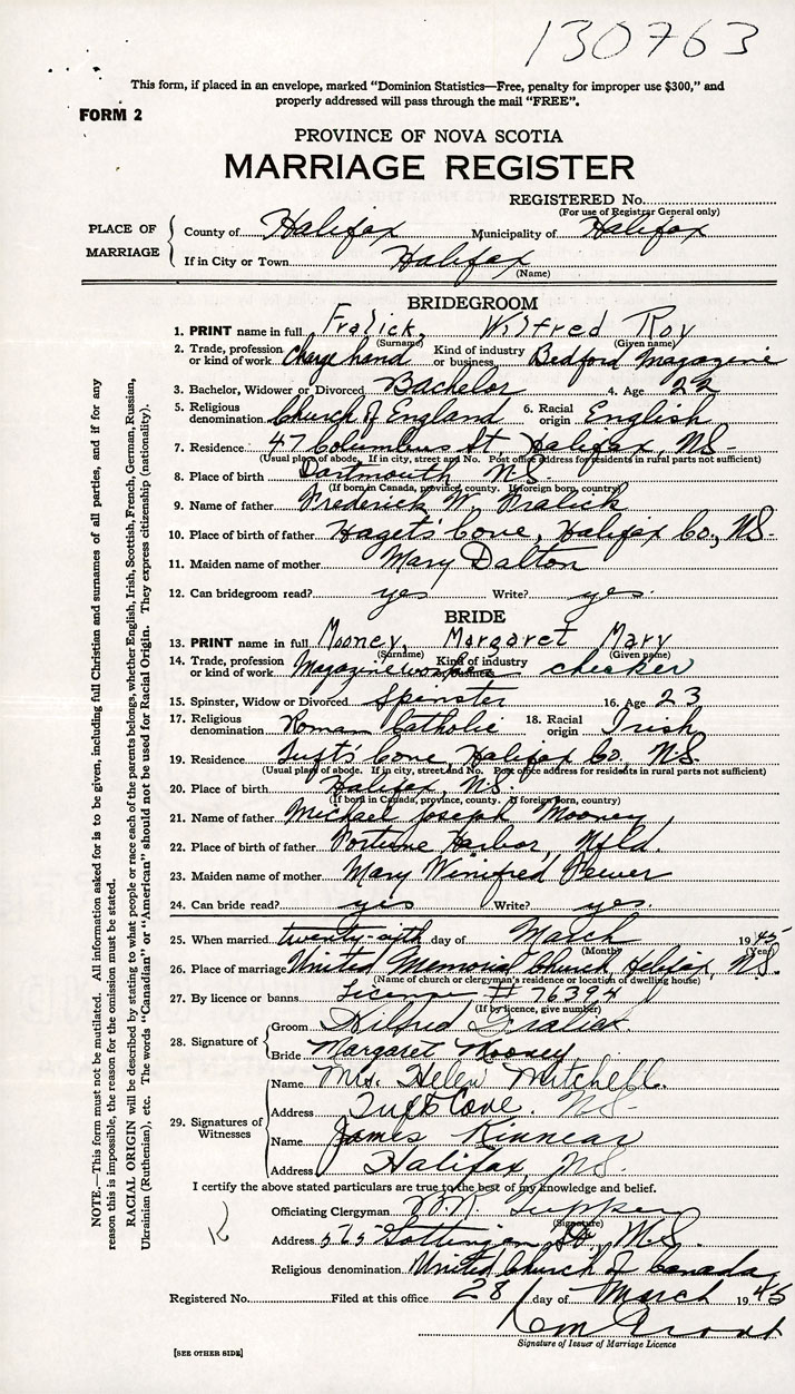 1. PRINT name in full Fralick, Wilfred Roy