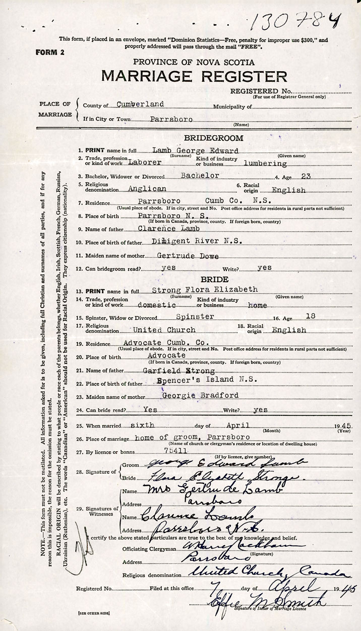 26. Place of marriage Parrsboro, Cumberland County