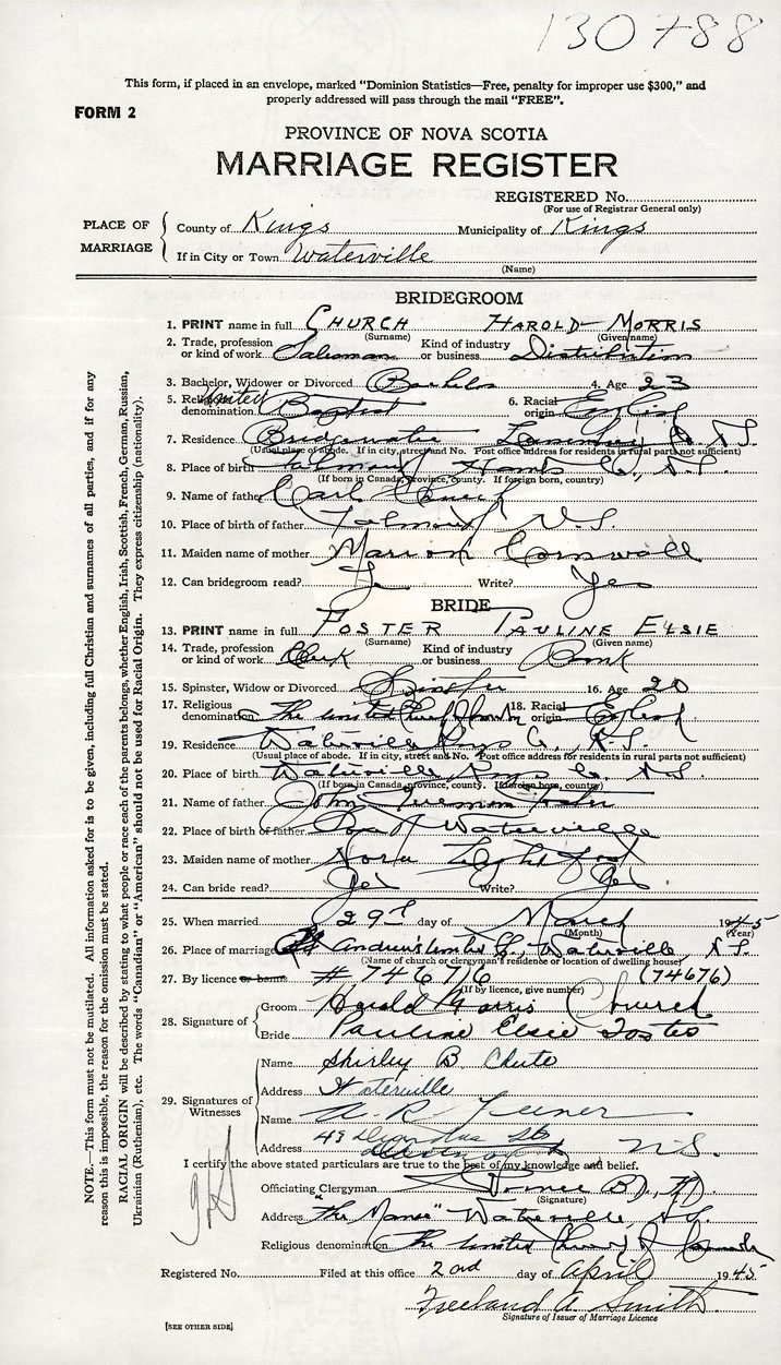 26. Place of marriage St. Andrew's United Church Wolfville, Kings County