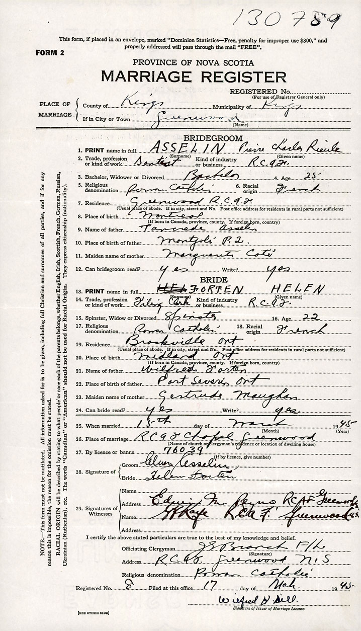 26. Place of marriage R.C.A.F. Chapel Greenwood, Kings County